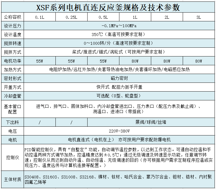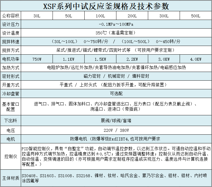 材質一般有碳錳鋼、不銹鋼、鋯、鎳基(哈氏、蒙乃爾、因康鎳)合金等有色金屬及其它復合材料,加熱/降溫方式,可分為電加熱、熱水加熱、導熱油循環(huán)加熱、蒸汽加熱、遠紅外加熱、外(內)盤管加熱、電磁感應加熱等,夾套降溫和釜內盤管降溫等。加熱方式的選擇主要跟化學反應所需的加熱/降溫溫度,以及所需熱量大小有關。攪拌器有錨式、框式、槳式、渦輪式,刮板式,組合式等多層復合槳。根據不同工作環(huán)境的工藝需要進行設計、制造。